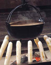 - たんぽは、粗くつぶしたあきたこまちを秋田杉で作った棒に巻き付けて焼いたものです。